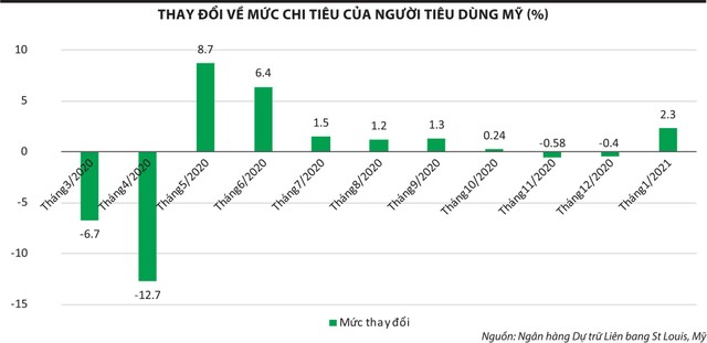Theo dữ liệu từ Ngân hàng Dự trữ Liên bang St Louis (Mỹ) được nêu trong bài viết trên MarketWatch ngày 26/2/2021, gói kích thích kinh tế đầu tiên vào tháng 5/2020 đã có tác động tích cực đến chi tiêu của người tiêu dùng.
