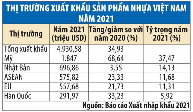 Số liệu của Cục Xuất nhập khẩu (Bộ Công thương) cho thấy, dẫu bị tác động tiêu cực của Covid-19, nhưng năm 2021, kim ngạch xuất khẩu sản phẩm nhựa của Việt Nam vẫn đạt 4,93 tỷ USD, tăng 34,9% so với năm 2020. Với mức tăng trưởng gần 35% (tương ứng tăng thêm gần 1,3 tỷ USD), là con số rất lớn so với tăng trưởng của nhiều ngành xuất khẩu khác.