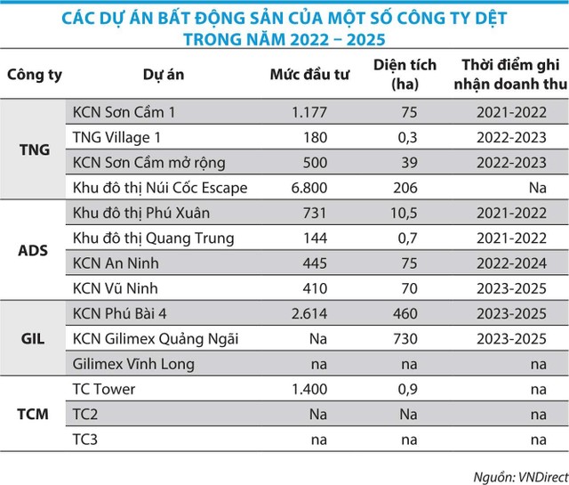 Một loạt doanh nghiệp dệt may như Công ty cổ phần Sản xuất kinh doanh Xuất nhập khẩu Bình Thạnh – Gilimex (GIL), ADS, Công ty cổ phần Dệt may Thành Công (TCM), Công ty cổ phần TNG (TNG) đã mở rộng kinh doanh sang lĩnh vực bất động sản và bất động sản khu công nghiệp.