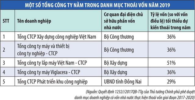 Theo Quyết định 1232/2017/QÐ-TTg của Thủ tướng Chính phủ phê duyệt danh mục doanh nghiệp có vốn nhà nước thực hiện thoái vốn giai đoạn 2017-2020, trong năm 2019, Nhà nước phải thoái vốn ở 62 doanh nghiệp. Thế nhưng, theo Bộ Tài chính, 7 tháng đầu năm nay mới chỉ thoái vốn được ở 9 doanh nghiệp với giá trị 690 tỷ đồng, thu về 1.587 tỷ đồng.