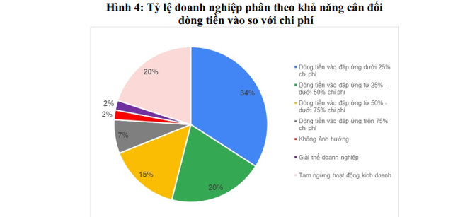 Cụ thể, theo kết quả khảo sát, có tới 76% số doanh nghiệp trả lời hiện không cân đối được thu chi, trong đó 54% doanh nghiệp có dòng tiền vào chỉ đáp ứng dưới 50% chi phí. Chỉ có 7% doanh nghiệp trả lời có dòng tiền vào đáp ứng trên 75% chi phí. Kết quả này hoàn toàn tương đồng với nhóm khó khăn lớn nhất “không có đơn hàng/khách hàng” mà các doanh nghiệp, hiệp hội đã phản ánh.