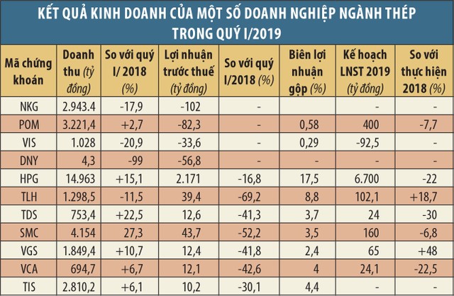 Yếu tố thị trường không thuận lợi do ảnh hưởng của kỳ nghỉ Tết, giá nguyên vật liệu đầu vào và đầu ra biến động không tương ứng so với cùng kỳ năm 2018 là lý giải chung về nguyên nhân kinh doanh kém khả quan trong quý I/2019, dù trên thị trường, giá thép trong nước có xu hướng tăng trở lại so với cuối năm 2018.