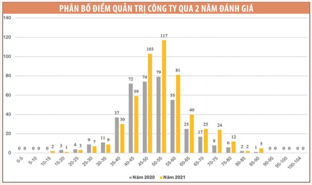 Điểm số cao nhất liên tục tăng lên qua các năm mặc dù bộ tiêu chí quản trị công ty có độ khó thay đổi, với doanh nghiệp có điểm cao nhất đạt điểm 89,56, cho thấy có những doanh nghiệp niêm yết có ban lãnh đạo công ty luôn chú trọng áp dụng các thông lệ quản trị tốt và liên tục cải thiện qua các năm, nhờ đó đạt được mức điểm cao hơn, cũng như liên tục xuất hiện trong các kỳ vinh danh quản trị tốt. Điểm trung bình năm 2021 tăng lên so với năm 2020, đạt 52,59 điểm. Tuy vậy, năm 2021 ghi nhận mức điểm thấp nhất trong mẫu khảo sát có giảm so với năm 2020 (do năm 2021 xuất hiện 2 công ty điểm thấp nhất là 12,37 điểm), vì lý do có nhiều doanh nghiệp mới lần đầu tiên được đưa vào đánh giá.