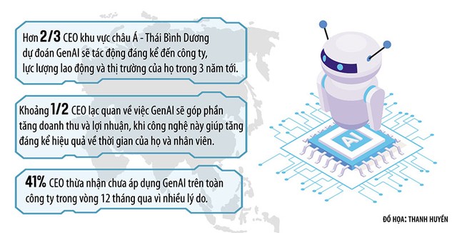 Trong nhóm các quốc gia, Australia dẫn đầu về áp dụng GenAI với tỷ lệ 63%, tiếp theo là Nhật Bản (50%), Ấn Độ và New Zealand (cả hai đều ở mức 39%). Tại Việt Nam, câu chuyện đầu tư theo trào lưu AI cũng đang nóng dần lên. Theo ông Bee Kheng, các công cụ GenAI đã mở ra những khả năng mới cho việc sáng tạo và đổi mới. Năm 2024, AI tiếp tục tăng tốc và trở thành yếu tố then chốt cho các doanh nghiệp Việt.