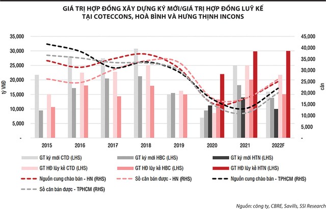 SSI Research dự phóng, giá trị hợp đồng ký mới của các công ty xây dựng kỳ vọng sẽ tiếp tục tăng trong năm 2022 và đây cũng là cơ sở đảm bảo việc làm cho các công ty xây dựng, cũng như là cơ sở cho giới đầu tư có thể dự phóng bức tranh tài chính khả quan hơn trong thời gian sắp tới.