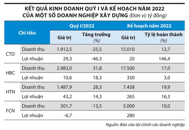 Trong quý I/2022, kết quả kinh doanh của 4 doanh nghiệp ngành xây dựng trên sàn chứng khoán có sự phân hóa (xem bảng), Hoà Bình và Hưng Thịnh Incons ghi nhận lợi nhuận tăng 18,3% và 14,3% so với cùng kỳ. Ngược lại, lợi nhuận của Coteccons sụt giảm, còn Fecon thua lỗ.