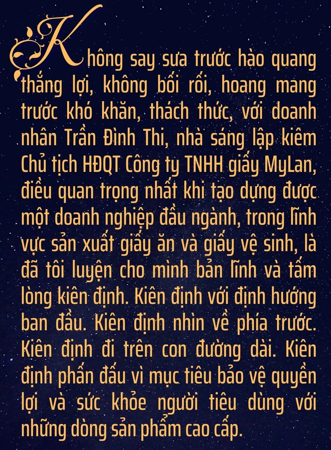 Thành quả của cả một tập thể luôn dựa vào tầm nhìn, định hướng sáng suốt của người lãnh đạo. Với doanh nhân Trần Đình Thi, bí quyết nào giúp ông chèo lái “con thuyền MyLan” của mình vững vàng đến thế!