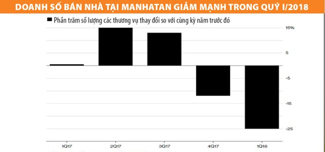 Doanh số bán nhà tại Manhattan giảm 25% trong quý I/2018 so với cùng kỳ năm trước đó, theo báo cáo được Miller Samuel Inc, công ty định giá và hãng môi giới Douglas Elliman Real Estate công bố. Đây là mức giảm mạnh nhất kể từ quý II/2009, khi thị trường bất động sản nơi đây đóng băng vì scandal Lehman Brothers Holdings Inc nộp đơn xin phá sản, kéo theo đó là những hệ lụy dẫn tới khủng hoảng tài chính toàn cầu.