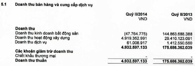 Theo đó, trong quý II, doanh thu thuần của HQC chỉ đạt có 4,9 tỷ đồng, giảm tới 97% so với cùng kỳ 2013 (gần 176 tỷ đồng). Trong đó, đáng chú ý là doanh thu từ hoạt động kinh doanh bất động sản của HQC đã ghi nhận âm gần 48 triệu đồng, trong khi cùng kỳ ghi nhận 145 tỷ đồng. Doanh thu từ hoạt động xây dựng cũng giảm mạnh từ mức 29,4 tỷ đồng cùng kỳ xuống còn 4,9 tỷ đồng ở kỳ này, tương ứng giảm 83%.