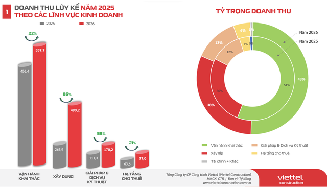 (ĐTCK) Tổng CTCP Công trình Viettel (Viettel Construction, mã CTR) mới công bố tình hình kinh doanh tháng 1/2026 với động lực tăng trưởng chính đến từ mảng xây dựng mang về 490,2 tỷ đồng, tăng 86% và chiếm 38% tổng doanh thu (tăng 8% so với cùng kỳ).