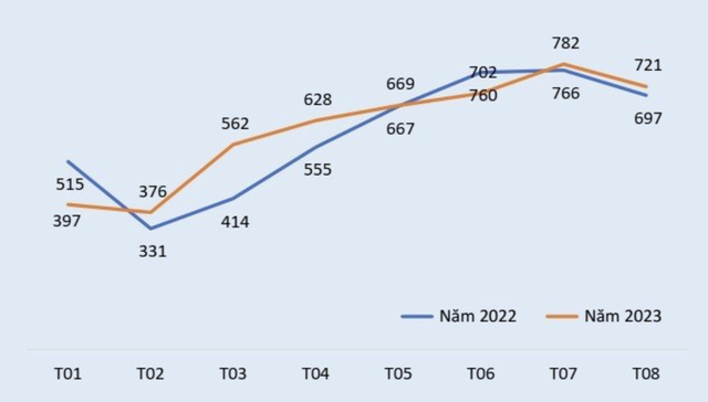 Trong tháng 8, TNG có doanh thu tiêu thụ đạt 721 tỷ đồng, tăng 3% so với cùng kỳ tháng 8/2022, nhưng giảm 7,8% so với tháng trước.
