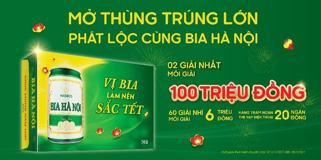 Là hoạt động được tổ chức thường niên nhằm tri ân những khách hàng luôn yêu mến đồng hành cùng Bia Hà Nội trong thời gian vừa qua và đón chào năm mới 2022 rực rỡ ngập tràn tài lộc, Bia Hà Nội chính thức triển khai hai chương trình khuyến mại Tết 2022 cực lớn áp dụng cho sản phẩm Bia Hà Nội Vàng và Bia Hà Nội Xanh với tổng giá trị giải thưởng lên tới 26 tỷ đồng.