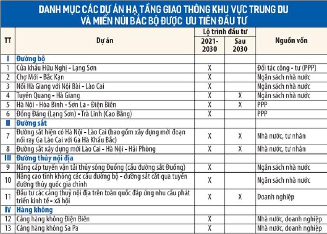 Theo tính toán, tổng nhu cầu vốn cho các dự án giao thông nói trên có thể lên tới 10 - 15 tỷ USD. Quy mô đầu tư này được đánh giá là có thể thay đổi diện mạo, chất lượng hạ tầng Vùng Trung du và miền núi Bắc Bộ.