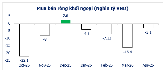 Bên cạnh đó, dòng vốn ngoại cũng cho thấy xu hướng thận trọng hơn kể từ sau tháng 10/2025. Sau giai đoạn quay lại mua ròng trong quý III/2025, khối ngoại đã chuyển sang bán ròng liên tục. Tính riêng trong quý I/2026, giá trị bán ròng đã lên tới hơn 58.000 tỷ đồng, kéo tỷ lệ sở hữu nước ngoài trên thị trường xuống khoảng 14,5%, thấp hơn đáng kể so với mức 16,4% ghi nhận vào tháng 10/2025.