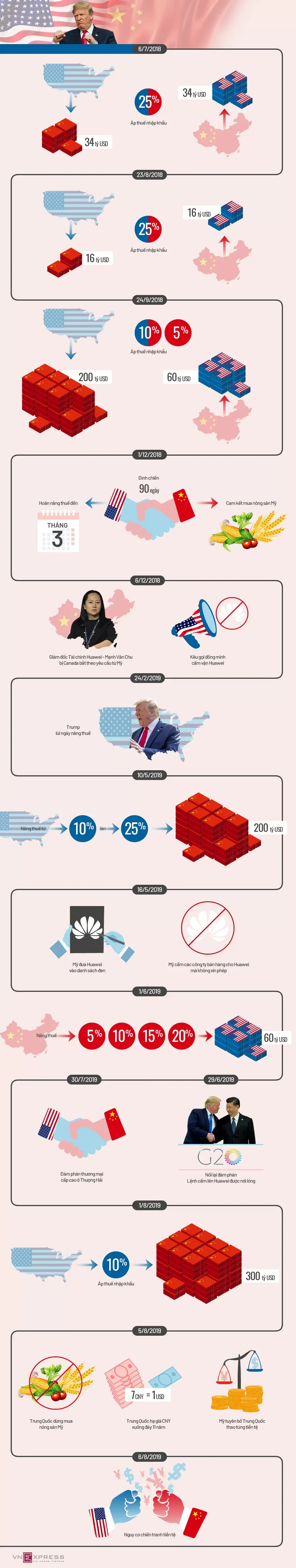 Hai nước liên tục áp thuế nhập khẩu lên nhau, trừng phạt doanh nghiệp, ngừng mua nông sản và hạ giá nội tệ để giành lợi thế.