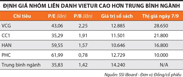 Thực tế, tới ngày 7/9/2023, nếu định giá theo P/E, ngoại trừ cổ phiếu CC1, với P/E là 35,29 lần, các doanh nghiệp còn lại đều có định giá cao hơn trung bình ngành (ở mức 35,83 lần). Tương tự, nếu định giá theo P/B, ngoại trừ cổ phiếu PHC, 3 cổ phiếu còn lại là VCG, CC1 và HAN đều có định giá cao hơn so với trung bình ngành.