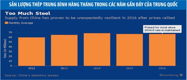 Trong 8 tháng đầu năm 2016, sản lượng thép trung bình mỗi tháng đạt 67,04 triệu tấn. Nếu sản xuất được thúc đẩy, sản lượng đầu ra ngành thép trung bình hàng tháng tại Đại lục có thể sẽ đạt mức cao nhất từ trước tới nay, vượt qua cả mức đỉnh 68,56 triệu tấn/tháng năm 2014.