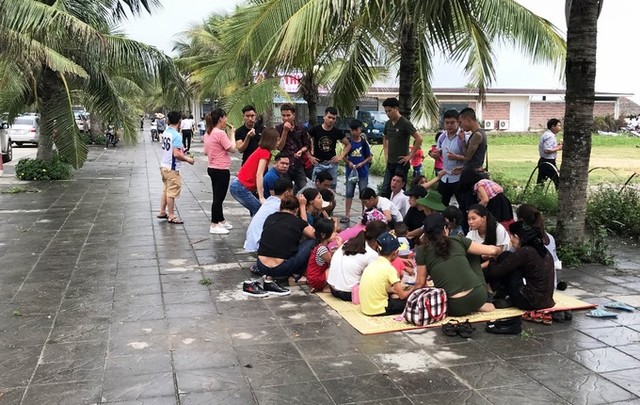 Một số du khách tỏ ra mệt mỏi ngồi bệt xuống gần khu vực lối ra vào cảng.