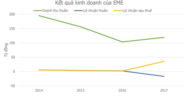 Năm 2017, EME đạt doanh thu 119,3 tỷ đồng, tăng 15% so với năm 2016. Tuy vậy, doanh thu không đủ bù đắp cho giá vốn khiến Công ty lỗ gộp 5,3 tỷ đồng. Dù tiết giảm chi phí như chi phí quản lý doanh nghiệp, EME vẫn lỗ thuần 16,9 tỷ đồng.