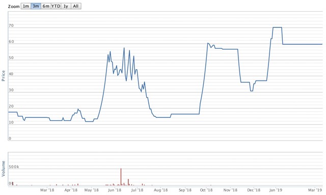 Trong một số phiên giao dịch đầu năm 2019, giá cổ phiếu EME rơi từ mức 70.000 đồng/cổ phiếu xuống 59.500 đồng/cổ phiếu và duy trì từ đó đến nay vì giá mua - bán không gặp nhau.