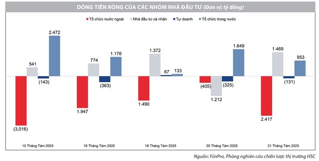 Thực tế, khối ngoại đã bán ròng hơn 30.000 tỷ đồng từ đầu tháng 8, khiến mức độ đồng thuận trên thị trường suy giảm. Tuy nhiên, chúng tôi cho rằng, đây chủ yếu là hoạt động quản trị rủi ro trong bối cảnh bất định, chứ không phản ánh thay đổi cơ bản về triển vọng. Minh chứng là trong những phiên rung lắc mạnh như ngày 20/8, áp lực bán đã giảm đáng kể nhờ lực cầu bắt đáy gia tăng về cuối phiên.