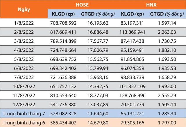 Chỉ số VN-Index có đà hồi phục rất tốt từ vùng 1.150 điểm và thanh khoản thị trường có sự cải thiện rõ nét từ cuối tháng 7 đến nay. Trong phiên giao dịch thứ Năm tuần trước (11/8/2022), thị trường bắt đầu có nhịp chỉnh đầu tiên với việc VN-Index giảm 0,35%, cùng với thanh khoản tăng mạnh lên gần 22.600 tỷ đồng trên cả 3 sàn, cho thấy áp lực chốt lãi mạnh đang diễn ra.