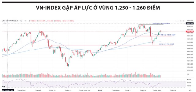 Mặc dù vậy, trong ngắn hạn, đà tăng của VN-Index đang gặp áp lực ở vùng 1.250 - 1.260 điểm, thậm chí có khả năng điều chỉnh về ngưỡng hỗ trợ 1.210 - 1.220 điểm.