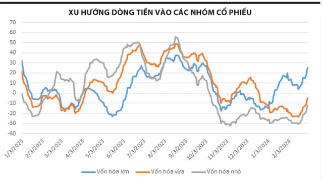 Sau khi VN-Index vượt ngưỡng 1.250 điểm thành công, dòng tiền có sự dịch chuyển mạnh mẽ sang nhóm cổ phiếu vốn hóa vừa và nhỏ. Đây là sự chuyển dịch hợp lý, bởi dòng tiền ở nhóm vốn hóa lớn đang có dấu hiệu đạt ngưỡng khi tiến lên sát mức cao nhất của năm 2023 và dư địa để tiếp tục tăng thêm không còn nhiều. Thay vào đó, nhóm vốn hóa vừa và nhỏ chỉ mới thu hút được dòng tiền và dư địa để dòng tiền gia nhập thêm là rất lớn, giúp giá của các cổ phiếu này dễ tăng hơn so với nhóm vốn hóa lớn đã tăng tương đối nhiều trong 2 tháng qua.