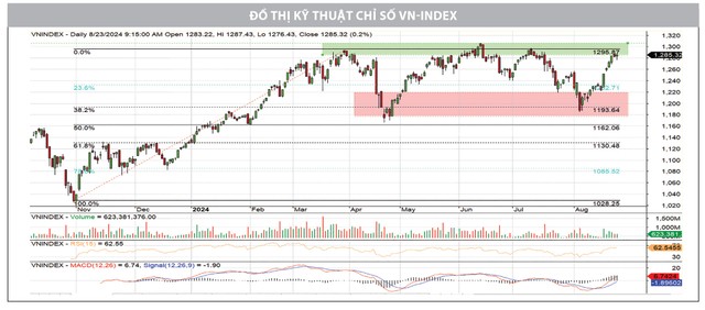Dưới góc nhìn kỹ thuật, sau khi xuất hiện phiên bùng nổ theo đà (FTD) ngày 16/8, diễn biến hồi phục của VN-Index được duy trì. Chỉ số bứt phá một số ngưỡng kháng cự, tiến gần đến ngưỡng cản lớn là 1.300 điểm. Thanh khoản được cải thiện rõ rệt, chứng tỏ dòng tiền ở lại thị trường và luân chuyển tích cực. Đây được đánh giá là điều kiện tốt để kiến tạo môi trường thuận lợi cho các giao dịch ngắn hạn.