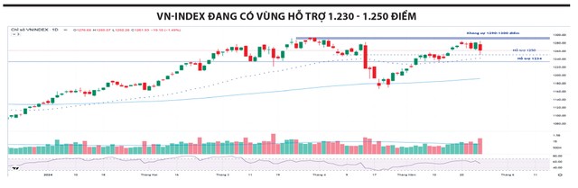 Nhìn chung, VN-Index được kỳ vọng sẽ tiến vào nhịp điều chỉnh kỹ thuật ngắn hạn, khi xu hướng tăng ngắn hạn có chiều hướng bị xuyên thủng. Nhịp giảm lần này được xem như điều chỉnh kỹ thuật khi áp lực bán tăng mạnh tại nhóm vốn hóa lớn trước đó có diễn biến tăng giá vượt trội. Khi dòng tiền rũ bỏ được áp lực chốt lời và lấy lại cân bằng tại nhóm vốn hóa vừa và nhỏ, VN-Index có thể tăng trưởng trở lại, kiểm nghiệm khu vực 1.290 - 1.300 điểm sau khi tạo nền giá mới.