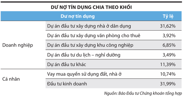 Trên thực tế, sau giai đoạn tập trung cho vay chủ đầu tư dự án, dư nợ tín dụng dành cho khối khách hàng cá nhân vay mua quyền sử dụng đất và kinh doanh bất động sản khác đã tăng trở lại trong thời gian qua (xem bảng).