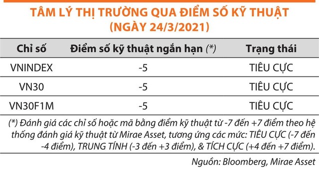 Bổ sung cho tâm lý tiêu cực này, phần lớn trong 100 mã có thanh khoản tốt nhất thị trường về giá trị giao dịch cũng có điểm số kỹ thuật tiêu cực hoặc trung tính theo thang điểm của Mirae Asset.