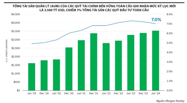 Tính đến cuối tháng 6/2024, tổng tài sản quản lý (AUM) của các quỹ tài chính bền vững toàn cầu ghi nhận mức kỷ lục mới là 3.500 tỷ USD, tăng 3,9% so với đầu năm và chiếm khoảng 7% tổng tài sản các quỹ đầu tư toàn cầu. Trong khi đó, tổng tài sản của các quỹ đầu tư truyền thống tăng khoảng 2,5% trong 6 tháng đầu năm nay. Sự gia tăng về tổng tài sản của quỹ đầu tư bền vững chủ yếu do tác động bởi hai yếu tố, hiệu quả đầu tư và dòng tiền mới.
