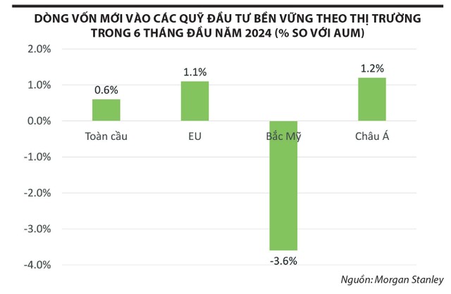 Trong cùng khoảng thời gian, các quỹ tài chính bền vững tiếp tục thu hút nhà đầu tư khi có thêm 20 tỷ USD vốn mới, tương đương 0,6% tổng tài sản. Châu Á là điểm sáng thu hút vốn đầu tư bền vững, trong khi dòng vốn rút ròng ở khu vực Bắc Mỹ.