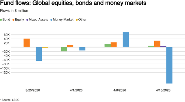 Theo ông Minh, các quỹ cổ phiếu toàn cầu đã nhận được dòng vốn chảy vào tuần thứ tư liên tiếp trong tuần kết thúc ngày 15/04, nhờ vào kết quả kinh doanh khả quan và sự lạc quan gia tăng rằng cuộc xung đột ở Trung Đông có thể được giải quyết nhanh hơn dự kiến đã thúc đẩy khẩu vị rủi ro.