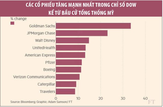 Chỉ số Dow đã tăng 8,3% kể từ bầu cử Tổng thống Mỹ, cao hơn nhiều so với mức tăng 6,1% của chỉ số S&P 500. Một phần xuất phát từ lý do, các cổ phiếu tài chính nằm trong Dow nhận được lợi thế lớn hơn từ cuộc bầu cử Tổng thống, so với các cổ phiếu công nghệ, vốn chiếm tỷ trọng lớn trong S&P 500.