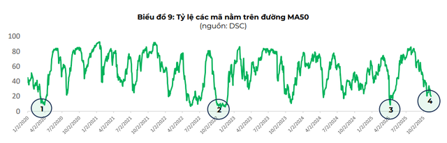 Từ 2020 tới nay, những lần chỉ số này chạm vùng cực trị thấp đều báo hiệu vùng cơ hội. Như ở vùng 1 - đáy Covid-19 và vùng 2 - Đáy khủng hoảng trái phiếu, bất động sản. Ở lần này, chỉ số các mã nằm trên đường MA50 cũng đang về vùng rất thấp - chỉ gần tương đương vùng 3 là vùng điều chỉnh do cú sốc thuế quan đợt tháng 4/2025.