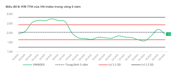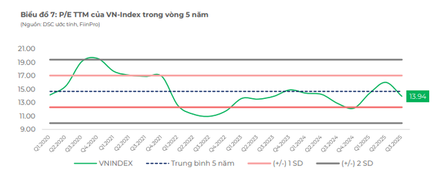 Hiện tại, với mức tăng trưởng lợi nhuận toàn thị trường dự báo khoảng 15% trong 12 tháng tới, P/E dự phóng 12 tháng của VN-Index chỉ còn khoảng 11,85 lần - đây là mức P/E rất thấp so với trung bình 5 năm. Mặt bằng giá của thị trường đang ở mức rẻ, mở ra nhiều cơ hội tích lũy cho nhà đầu tư dài hạn khi kỳ vọng lợi nhuận doanh nghiệp tiếp tục tăng trưởng.