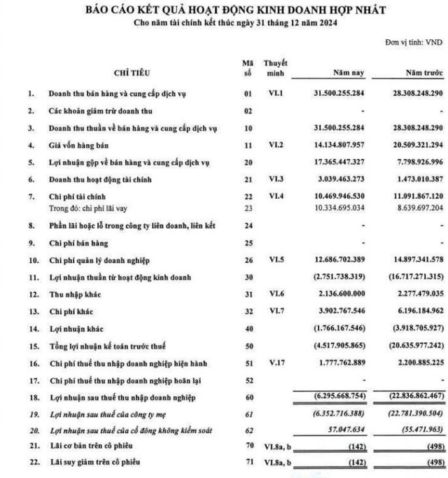 Tuy vậy, do giá vốn hàng bán vẫn duy trì ở mức cao (hơn 14 tỷ đồng), kèm chi phí tài chính cao (gần 10,5 tỷ đồng, chủ yếu là chi phí lãi vay hơn 10,3 tỷ đồng), chi phí quản lý doanh nghiệp (12,7 tỷ đồng) và một số chi phí khác (hơn 3,9 tỷ đồng), kết quả, Eximland tiếp tục báo lỗ hơn 6,3 tỷ đồng, trong khi năm 2023 lỗ hơn 22,8 tỷ đồng.