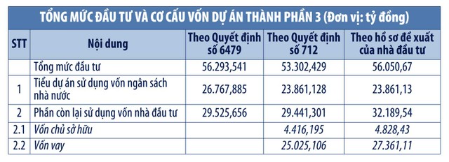 Được biết, giá đề xuất của Liên danh CityLand - Saigon Sunflower - VEC - Horizon là 56.050 tỷ đồng. Trong đó, tiểu dự án sử dụng vốn nhà nước trong dự án PPP có tổng vốn đầu tư 23.861 tỷ đồng; phần còn lại sử dụng vốn nhà đầu tư là 32.189,54 tỷ đồng. Thời gian thu phí hoàn vốn Dự án thành phần 3 (theo đề xuất của nhà đầu tư) là 21,36 năm.
