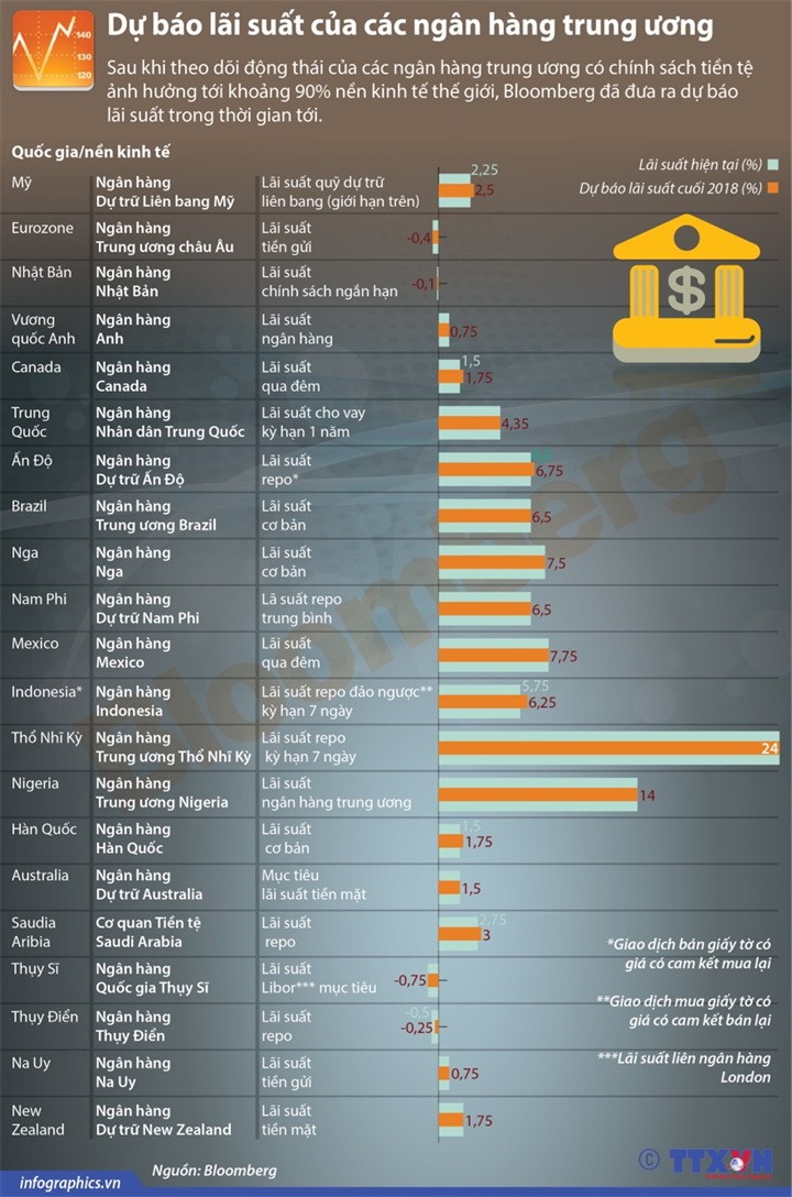 Sau khi theo dõi động thái của các ngân hàng trung ương có chính sách tiền tệ ảnh hưởng tới khoảng 90% nền kinh tế thế giới, Bloomberg đã đưa ra dự báo lãi suất trong thời gian tới.