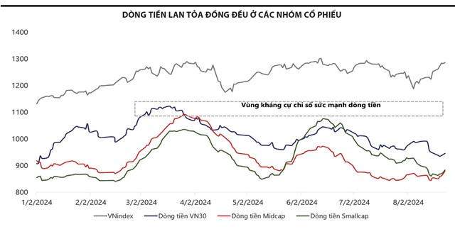 Trên biểu đồ kỹ thuật, chỉ số VN-Index tuần qua tăng 2,64%, đạt 1.285,32 điểm, áp sát ngưỡng kháng cự tâm lý 1.300 điểm. Tuy vậy, động lượng của chỉ báo dòng tiền cho thấy, đà hồi phục hiện tại chỉ là giai đoạn đầu. Sự lan tỏa dòng tiền đồng đều giúp dòng tiền trên cả ba nhóm cổ phiếu theo quy mô vốn hóa đều chưa “nóng”, dư địa tăng của các nhóm cổ phiếu vẫn còn. Trong đó, sức mạnh dẫn dắt tại nhóm cổ phiếu vốn hóa lớn (VN30) và sự bứt tốc ở nhóm vốn hóa trung bình (Midcap).