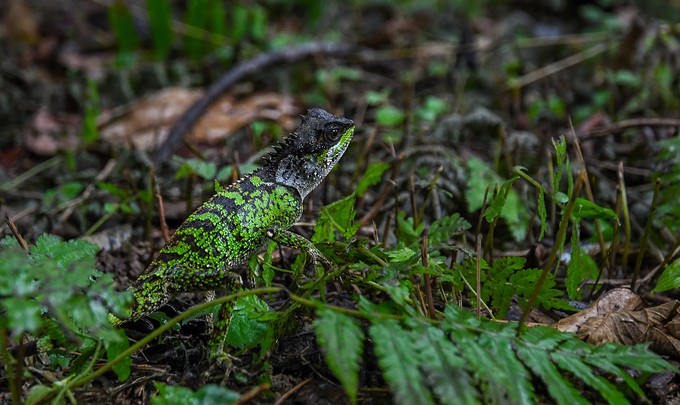 Theo thống kê của ban quản lý vườn, Cúc Phương còn là ngôi nhà của 122 loài bò sát, lưỡng cư, 135 loài thú và hơn 2.000 loài côn trùng. Trong ảnh là một con kỳ nhông đang kiếm ăn trong rừng, với thức ăn là côn trùng, bướm.