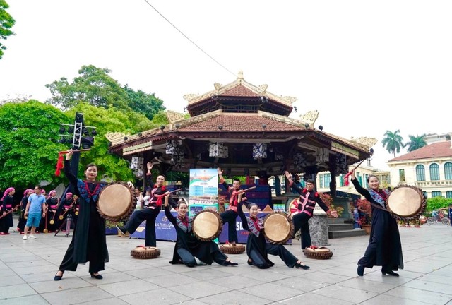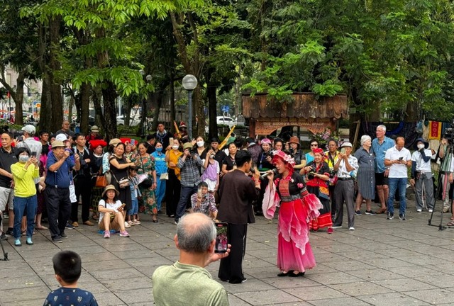 Những lời ca tiếng hát và vũ điệu mang đậm dấu ấn của văn hóa Tây Bắc qua các tiết mục nghệ thuật như: “Múa Trống hội bản Dao”, “Vũ điệu dưới trăng”, “Mùa vàng trên nương”, Múa chuông Dao”… khiến du khách trên phố đi bộ Hồ Gươm mê say.