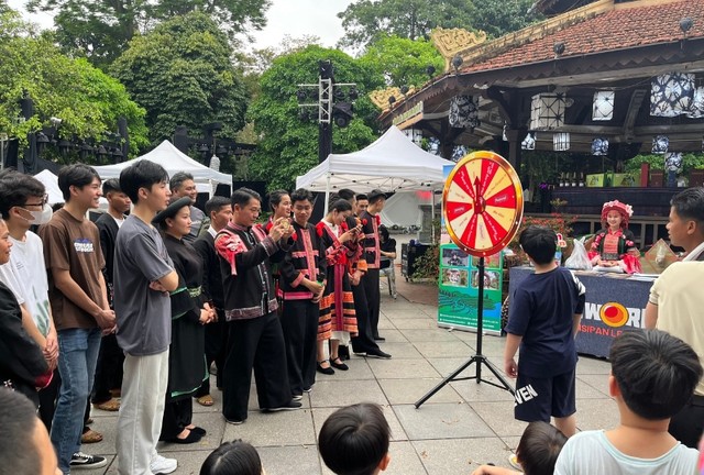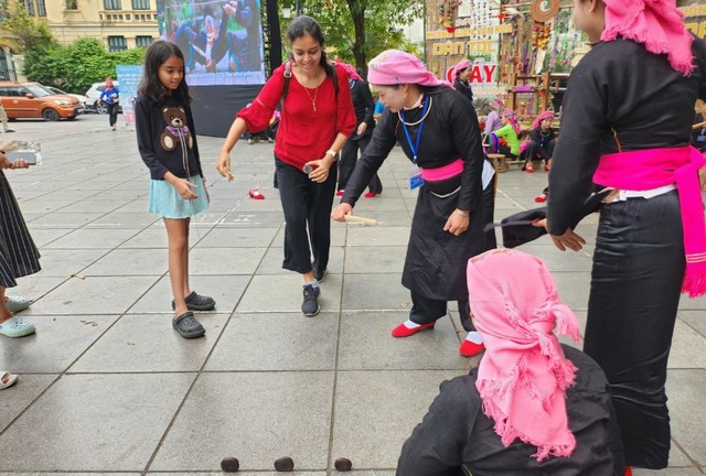 Nhiều du khách quốc tế tỏ ra thích thú khi được trải nghiệm các trò chơi dân gian của Sa Pa ngay tại thủ đô như: đánh én, ném pao hát ống trích, đánh quả lệ, đánh yến…