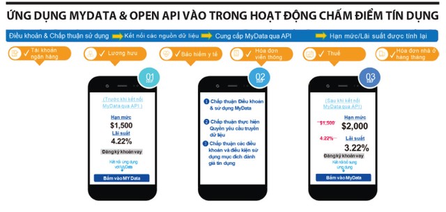 Lấy ví dụ về ứng dụng MyData vào chấm điểm tín dụng. MyData cho phép các công ty chấm điểm tín dụng sử dụng dữ liệu từ tài khoản ngân hàng, giao dịch viễn thông, bảo hiểm, chứng khoán và các nguồn khác để đánh giá tín dụng một cách toàn diện hơn. Dữ liệu từ MyData giúp cải thiện khả năng phân biệt rủi ro, tăng độ chính xác của hệ thống chấm điểm. Đồng thời, cơ chế chấm điểm tín dụng như vậy sẽ phù hợp với những khách hàng không có lịch sử tín dụng (thin-file). Các khách hàng này vẫn có thể nhận được đánh giá tín dụng chính xác dựa trên dữ liệu giao dịch hoặc hành vi tài chính tích cực.