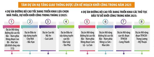 Cụ thể, 16 dự án/dự án thành phần với tổng chiều dài 786 km, trong đó Bộ Xây dựng chủ quản 14 dự án với chiều dài 760 km, có điều kiện thuận lợi hoặc các khó khăn, vướng mắc đã cơ bản được giải quyết, đang triển khai bám sát kế hoạch hoàn thành trong năm 2025. Trong số này, nhiều dự án thành phần sẽ phấn đấu rút ngắn thời gian thi công từ 3 đến 6 tháng, gồm 10 dự án thành phần cao tốc Bắc - Nam phía Đông giai đoạn 2021 - 2025; Hòa Liên - Túy Loan; Dự án thành phần 3 Biên Hòa - Vũng Tàu; Cao Lãnh - Lộ Tẻ; Lộ Tẻ - Rạch Sỏi; Bến Lức - Long Thành (trừ 3 km cầu Phước Khánh) và vành đai 3 TP.HCM đoạn qua Long An