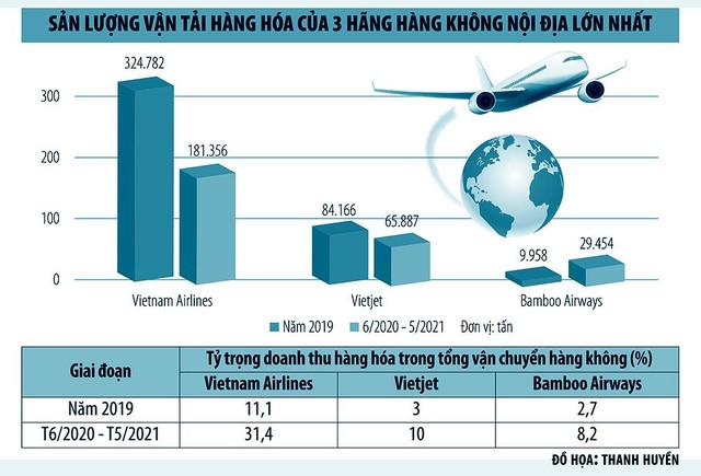 Cục Hàng không Việt Nam cho biết, đến cuối tháng 6/2021, các hãng hàng không đã hoán đổi 9 tàu bay sang chở hàng theo hình thức tháo ghế hành khách để chở hàng trên khoang. Một số tàu bay (chưa tháo ghế) cũng chở hàng trên khoang hành khách với điều kiện không chở khách trên cùng chuyến bay. Tỷ trọng doanh thu từ vận tải hàng hóa trong tổng doanh thu từ vận tải hàng không của các hãng hàng không trong giai đoạn dịch bệnh tăng gấp 3 lần so với giai đoạn trước dịch.