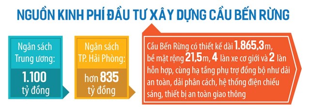 Trong đó, ngân sách Trung ương bố trí 1.100 tỷ đồng; ngân sách TP. Hải Phòng bố trí hơn 835 tỷ đồng. Cầu Bến Rừng dài 1.865,3 m; bề mặt rộng 21,5m; 4 làn xe cơ giới và 2 làn hỗn hợp, cùng hạ tầng phụ trợ đồng bộ như dải an toàn, dải phân cách, hệ thống điện chiếu sáng, thiết bị an toàn giao thông.