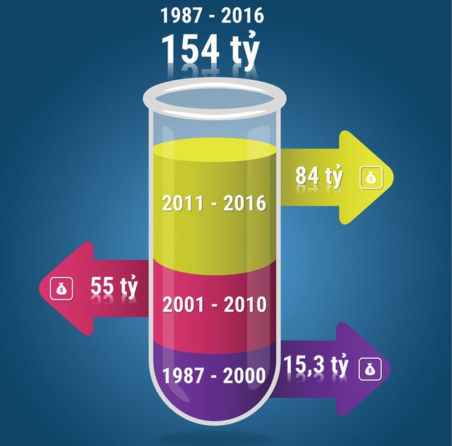 Với 154 tỷ USD vốn FDI thực hiện trong 30 năm, thì từ 1987 đến 2000 chỉ có 15,3 tỷ USD; 10 năm tiếp theo (2001-2010) là 55 tỷ USD và 6 năm gần đây (2011- 2016) đạt 84 tỷ USD. Như vậy, từ năm 2011 đến 2016 chiếm 54,5%.